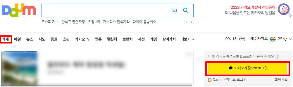 ① 우측의 카카오계정으로 로그인 → 로그인 후 왼쪽 상단의 <카페>를 클릭해주세요