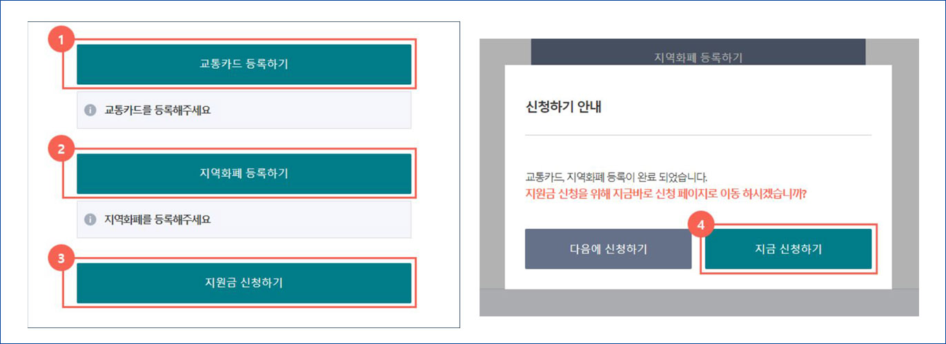 ④ 교통카드, 지역화폐 등록 후 → 지금 신청하기 클릭