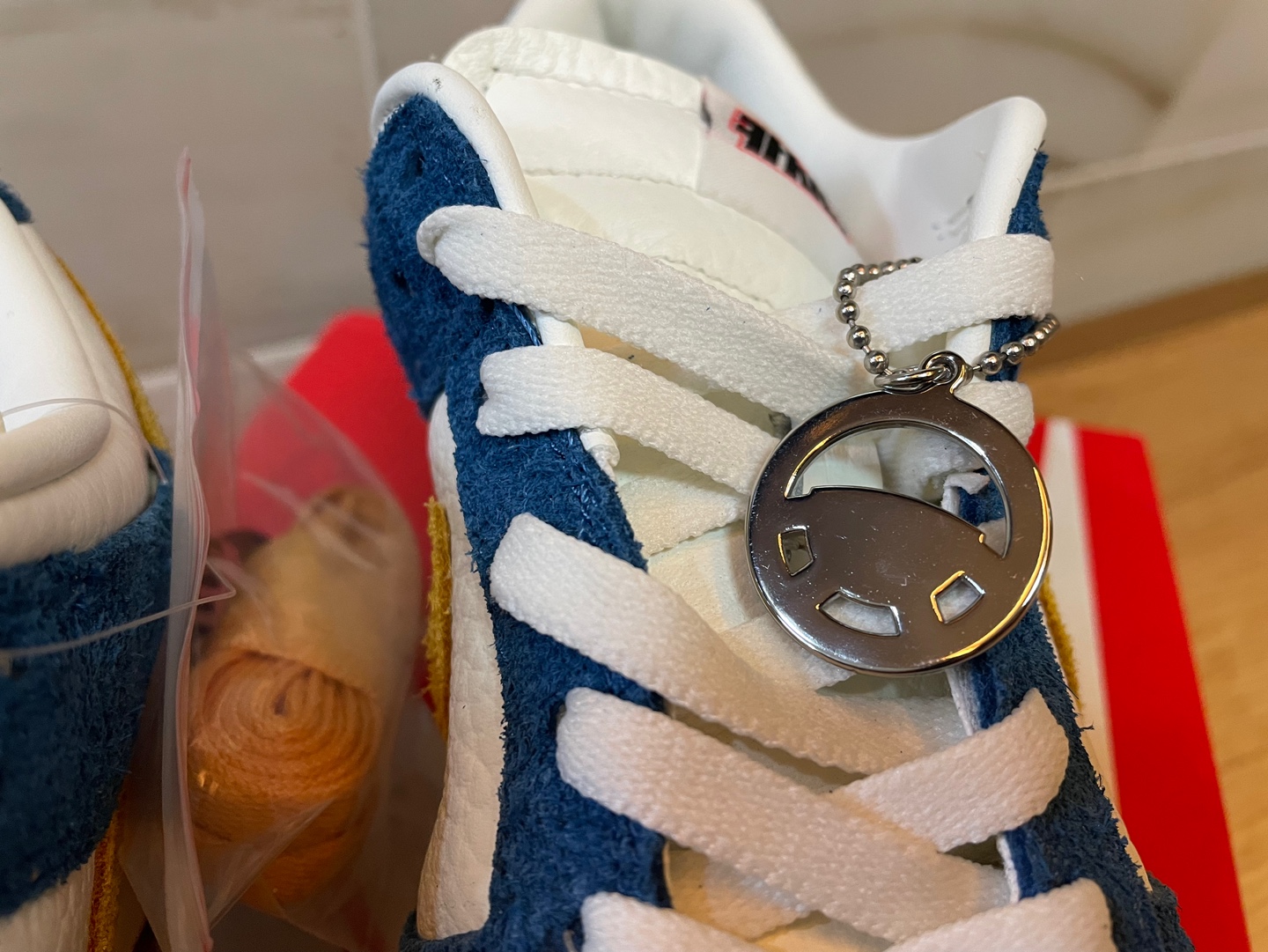 짙은 네이비 컬러와 짙은 옐로우 스우시가 묵직한 느낌을 자아냅니다. 쭈들이 가죽의 바디와 스웨이드로 이루어져 있는데, 스웨드도 거친 스웨이드를 사용하여 더욱 강렬한 인상을 줍니다. 나이키 스우시도 특이하게 스웨이드 재질을 사용하였습니다.