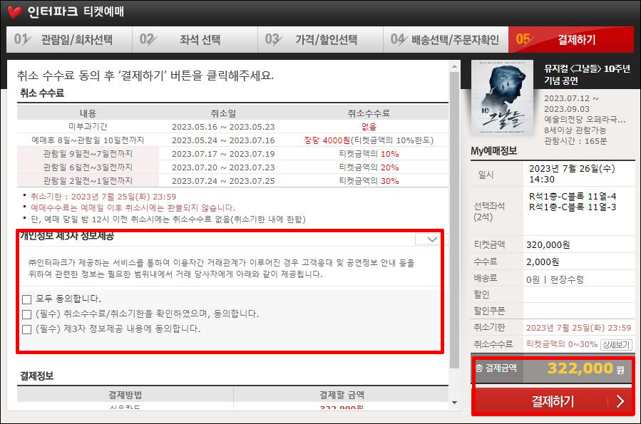 ⑥ 맨 하단의 개인정보 <모두 동의> 체크 → 결제하기 → 예매완료