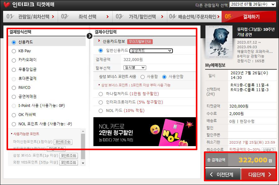 ⑤ 편리하신 결제방식 선택 → 결제수단 입력 → 예매정보 확인 후 결제금액 확인