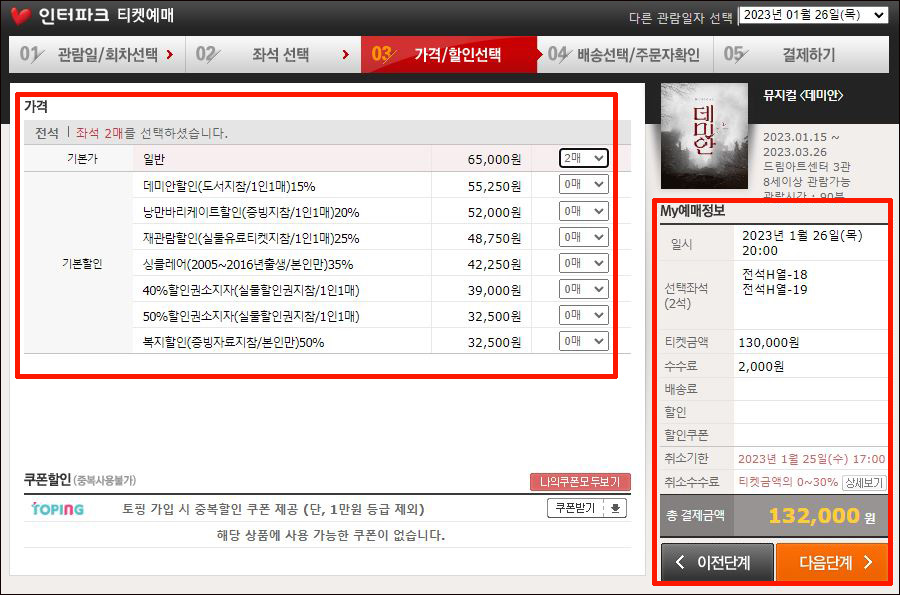 ④ 가격 및 할인선택 → 매수 선택 → 마이 예매정보 확인 → 총 결제금액 확인 → 다음단계