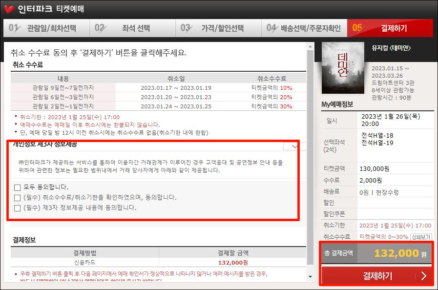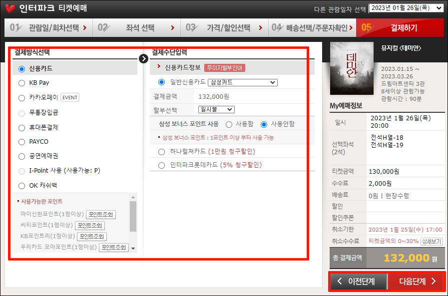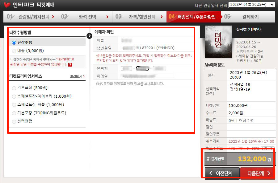 ⑤ 티켓 수령방법 선택(현장, 배송) → 예매자 정보 확인 및 수정 → 총 결제금액 확인 → 다음단계 클릭