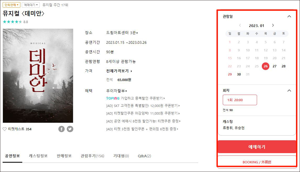 ① 데미안 <티켓예매>를 누르시면 티켓예매 페이지로 바로 이동이 가능합니다.