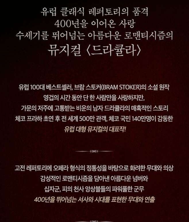 로맨틱 뮤지컬 드라큘라가 오는 15일 개막하여 23년 1월 15일까지 관객들과 만난다. 1897년 브람 스토커의 소설 원작 "드라큘라"를 1995년 뮤지컬로 초연하며 세계 각국에서 500만 명 이상의 관객을 모은 스테디셀러이다.