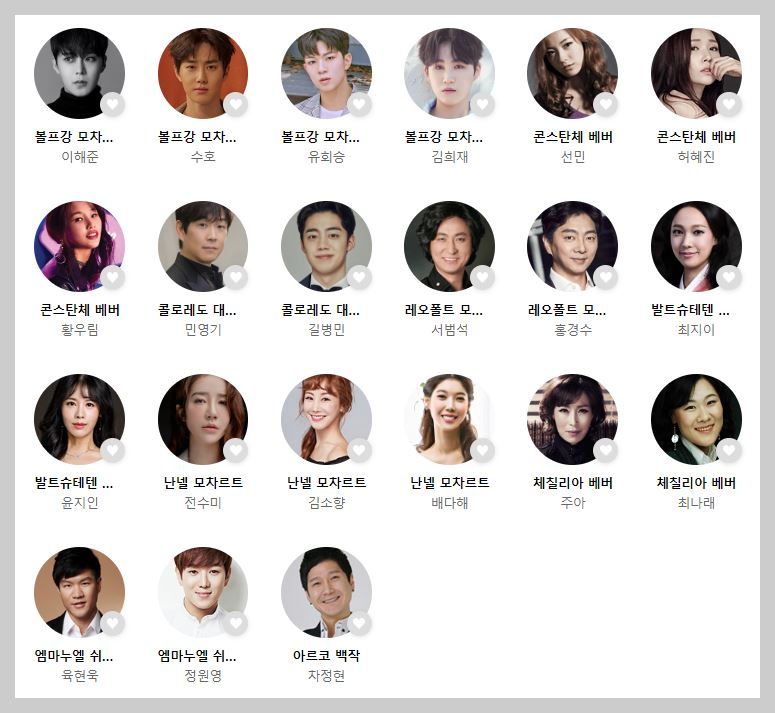 모차르트의 누나 "난넬 모차르트"에는 전수미, 김소향, 배다해가, "체칠리아 베버"역에는 주아, 최나래가 나서고, "임마누엘 쉬카네더"역에는 윤현욱, 정원영이 무대에 오른다.