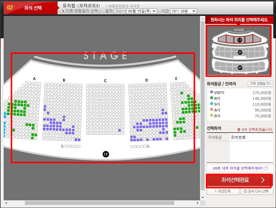 ③ 좌석 선택(1, 2, 3층) → 좌석잔여석 확인 → 좌석선택