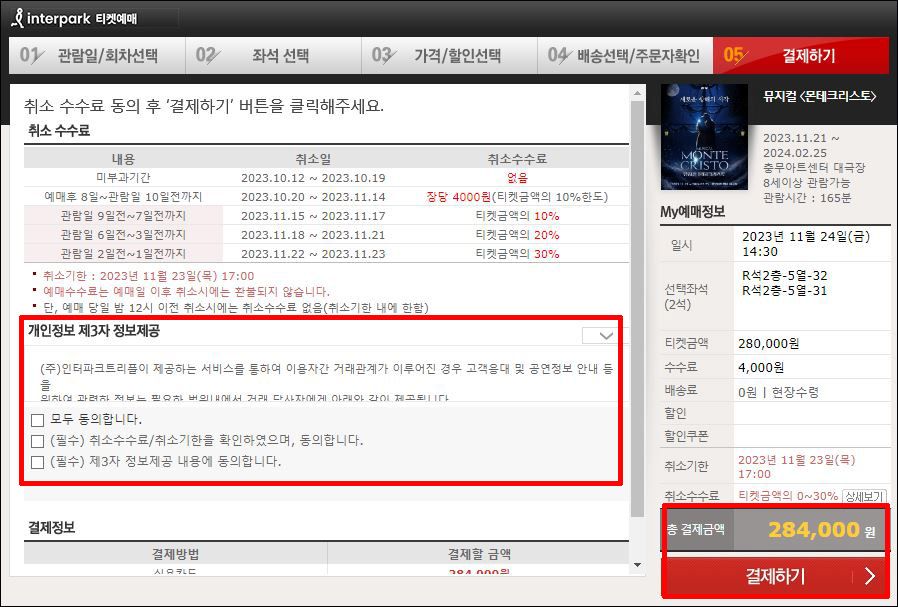 ⑦ 티켓 취소 수수료 정보 확인 → 개인정보 제공 <모두 체크> → 결제하기 → 예매완료