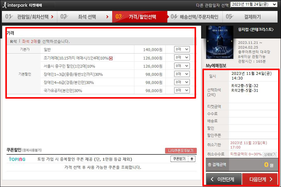 ④ 가격 및 관람 티켓 매수 선택 → 예매정보 확인 → 다음단계