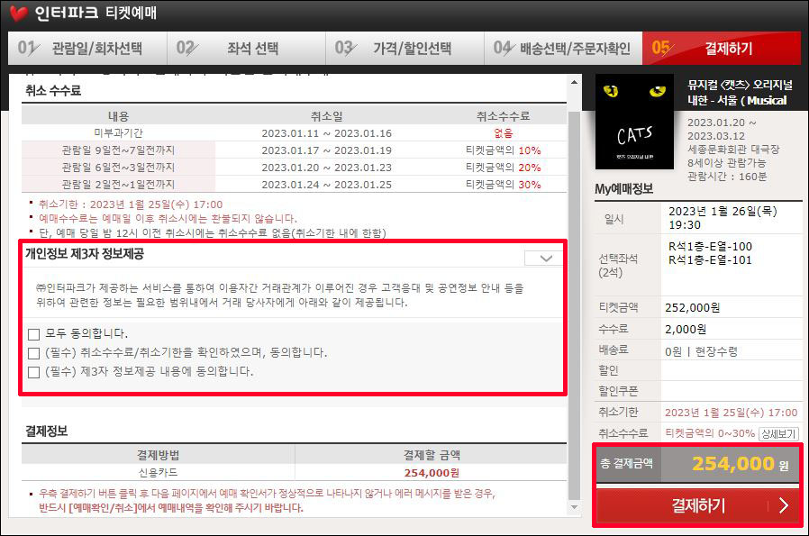 ⑥ 개인정보 제삼자 정보제공 확인 → 모두 동의 체크 → 결제하기
