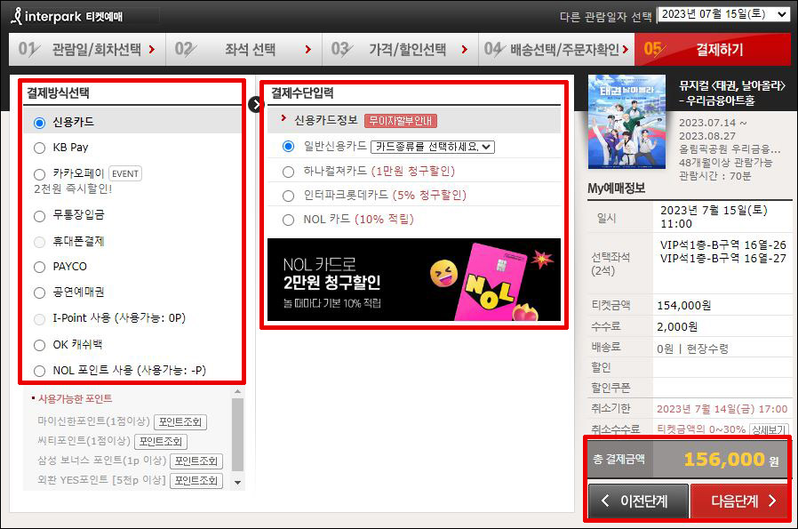 ⑤ 결제방식선택 → 결제수단 입력 → MY 예매정보 확인 → 결제금액 확인 → 다음단계