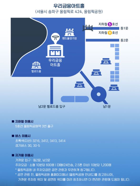 - 공연장 주소 : 서울시 송파구 올림픽로 424, 올림픽 공원 內 우리금융아트홀