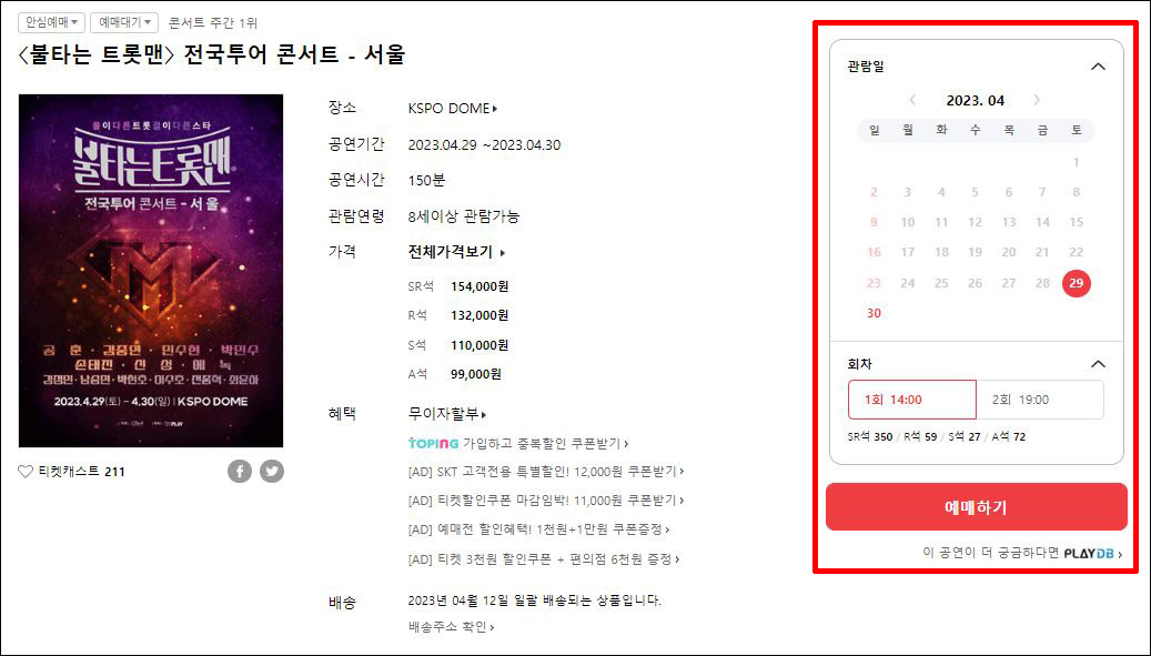 오는 4월 29일부터 30일까지 열리는 불타는 트롯맨 콘서트의  좌석 이미지를 확인하시길 바란다. 가격 정보는 다음과 같다.
