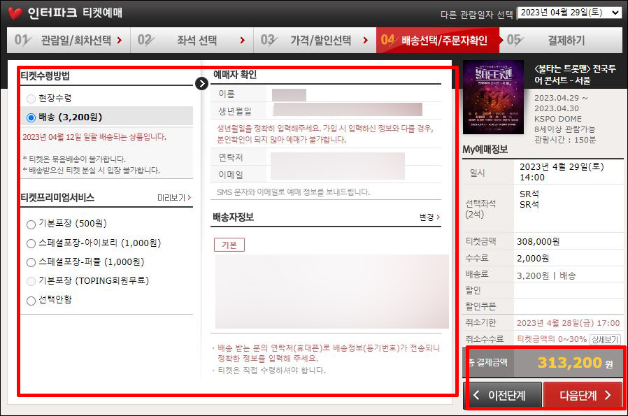 ⑤ 티켓수령방법 선택  예매자 정보 확인  배송자정보 확인  총 결제금액 확인  다음단계