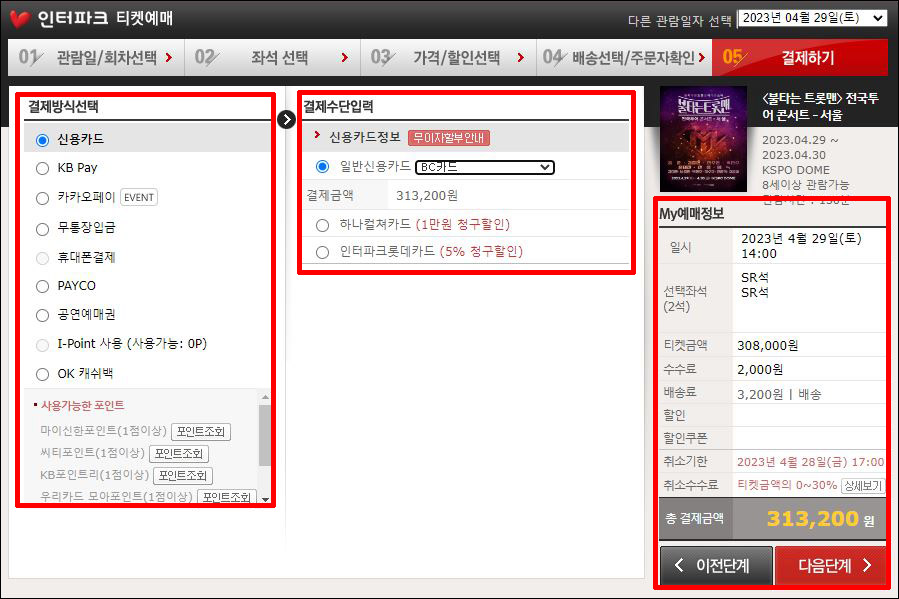 ⑥ 결제방식 선택  결제수단입력  마이예매정보 확인  다음단계