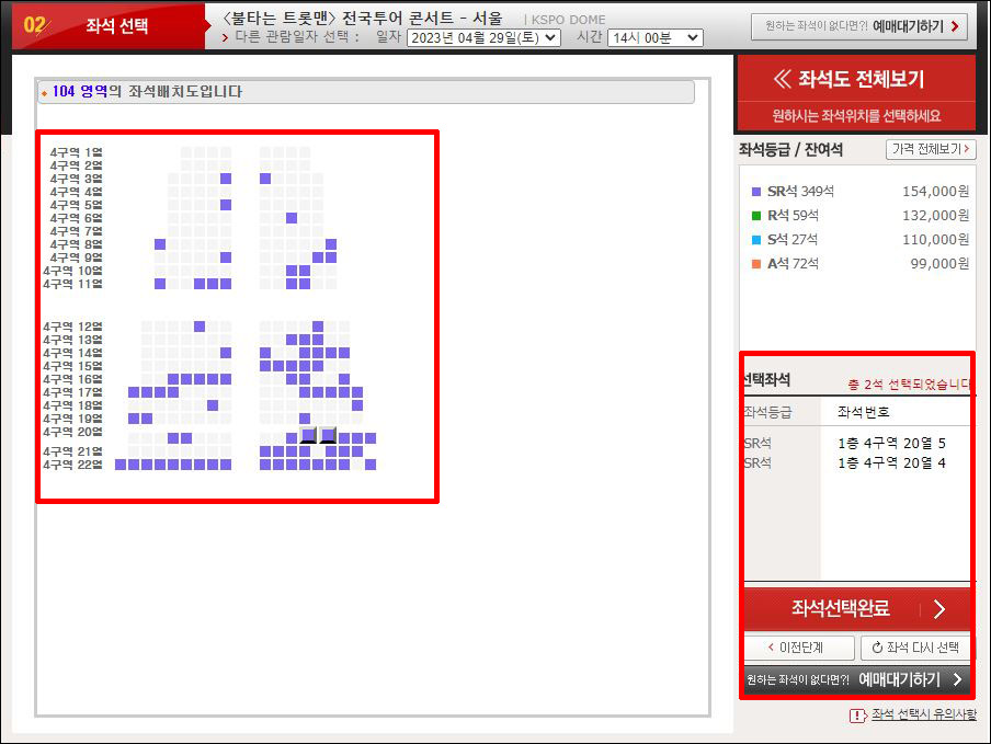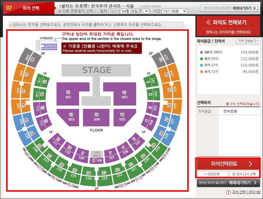 ④ 원하시는 좌석의 구역과 열을 선택 → 선택좌석 정보 확인  좌석선택완료 클릭