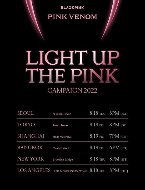 블랙핑크 정규 2집 컴백에 앞서 공식 채널을 통해 컴백 기념 [라이트 업 더 핑크] 캠페인 포스터를 공개했습니다. LIGHT UP THE PINK 캠페인은 각 도시를 대표하는 명소에서 블랭핑크의 대표 컬러인 핑크색의 조명을 밝히는 행사입니다.