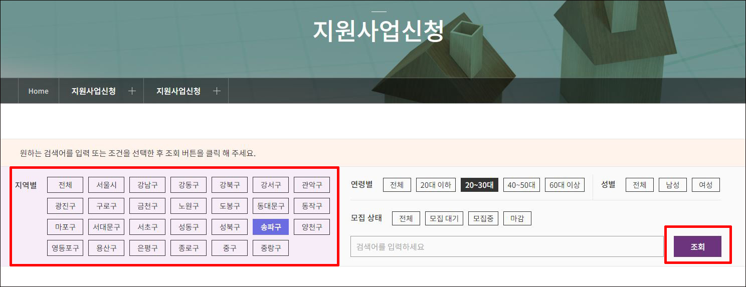 ② 지원사업 페이지에서 거주 지역을 선택 → 연령별 선택 → 성별 선택 → 하단의 조회 클릭