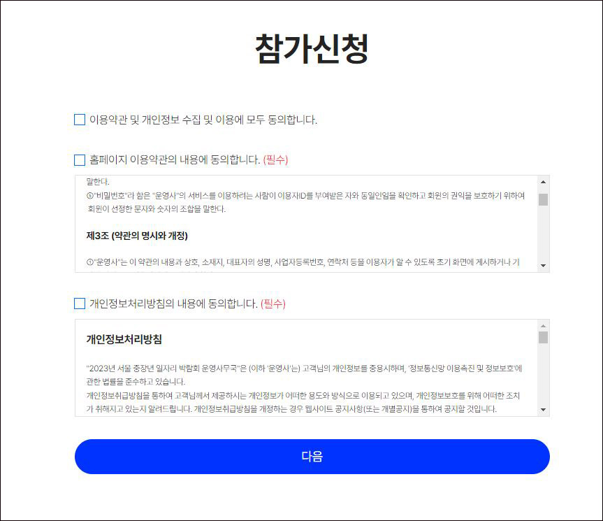 ③ 참가신청 페이지에서 하단의 "이용약관"을 모두 체크하시고 <다음>을 눌러 진행한다.