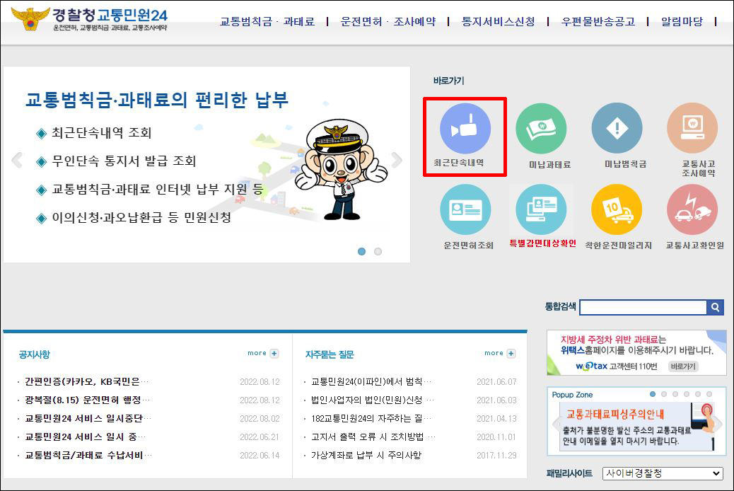 ① 경찰청교통민원 24시간 홈페이지 메인화면 우측의 <최근 단속내역>을 클릭합니다.