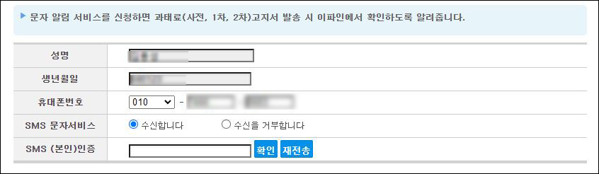 ② 성명, 생년월일, 휴대폰 등 개인정보를 입력 후, sms 문자서비스를 수신합니다를 선택한 후, 핸드폰 인증을 통해 알림 신청을 하실 수 있습니다. 교통법규 위반사항 시 문자로 확인되니 쉽게 편리하게 위반사실을 알 수 있습니다.