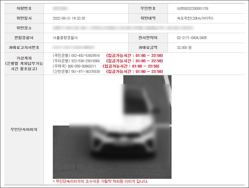 ④ 위반일시, 장소, 내역 등을 확인할 수 있습니다. 가상계좌 정보도 확인이 가능합니다. 과태료 및 범칙금의 납부도 가상계좌로 납부가능하니 납부까지 하시는 것을 추천드립니다.