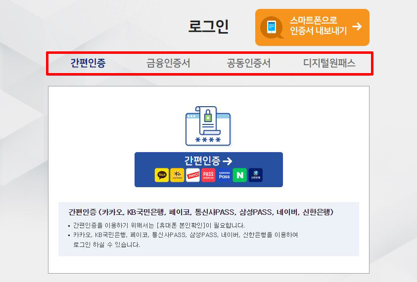 ※ 간편인증, 금융인증서, 공동 인증서, 디지털원패스 등 자신에게 편리한 방법을 이용해주세요