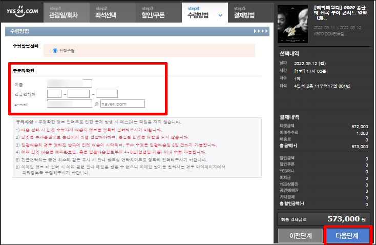 ⑤ 수령방법을 선택(현장 수령)하고, 주문자 정보를 확인합니다.
