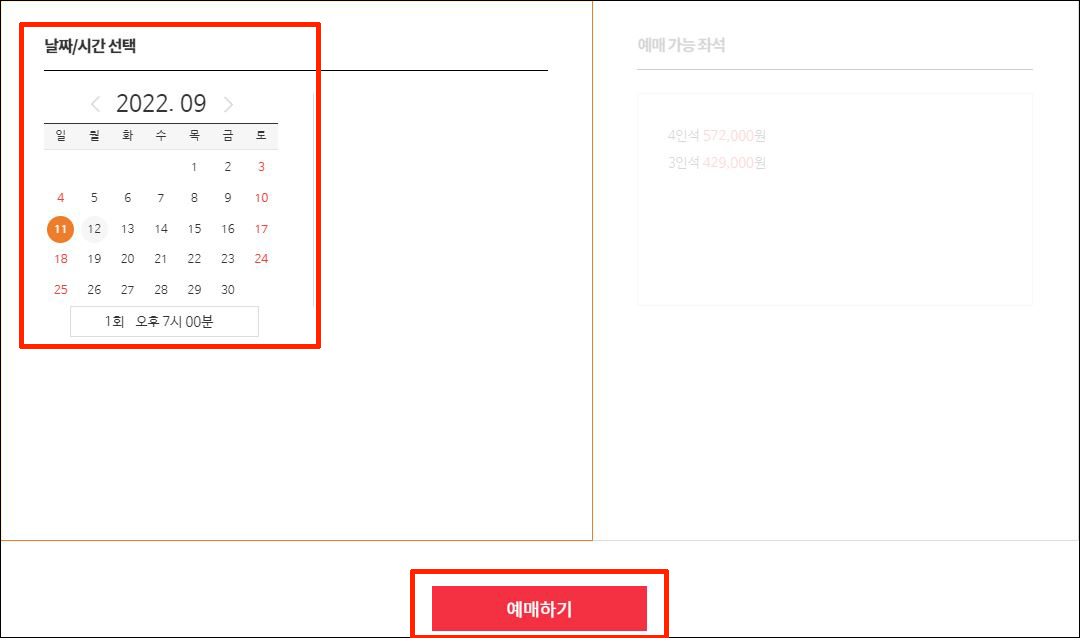 ① 첫 번째로 날짜와 시간을 선택하고 우측의 좌석을 예매합니다. 하단의 예매하기 클릭