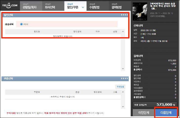 ④ 할인/쿠폰을 선택하시고 <결재내역>을 확인 후 다음 단계를 클릭합니다.