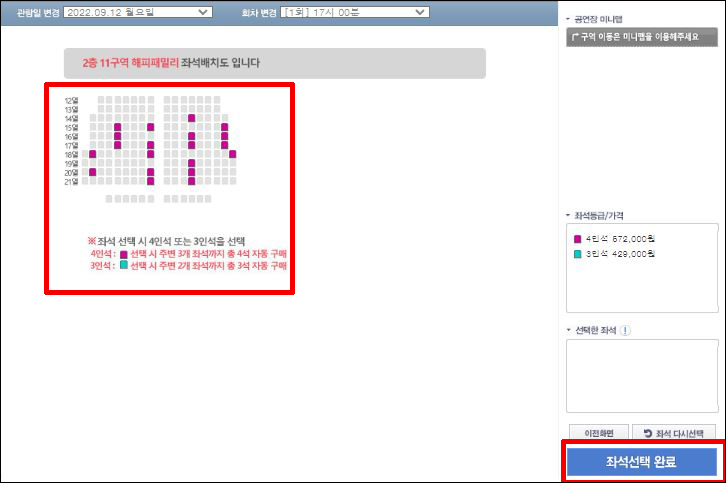 ③ 좌석을 선택하시고 지정하신 구역의 좌석배치도에서 좌석을 선택합니다. → 좌석 선택 완료
