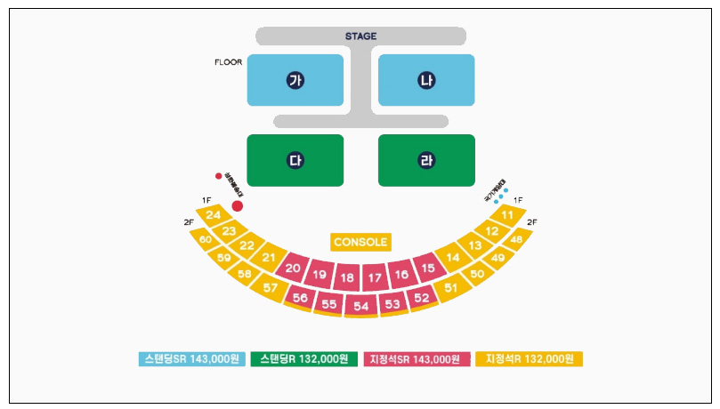 - 스탠딩 구역은 공연 2시간 전부터 마련된 스탠딩 대기 구역에서 입장 순서대로 입장하여 대기합니다.