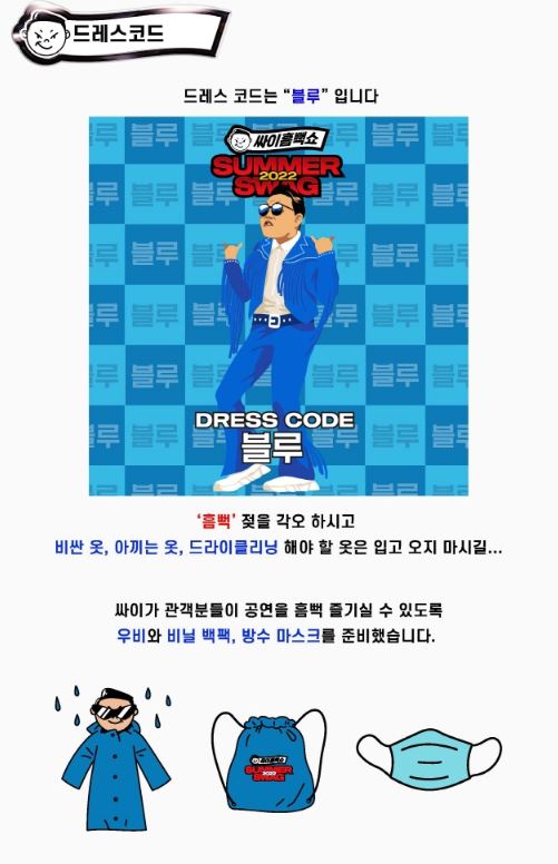 - 관람객 드레스코드는 블루로, 공연장에서 우비, 백팩, 방수 마스크를 제공합니다.