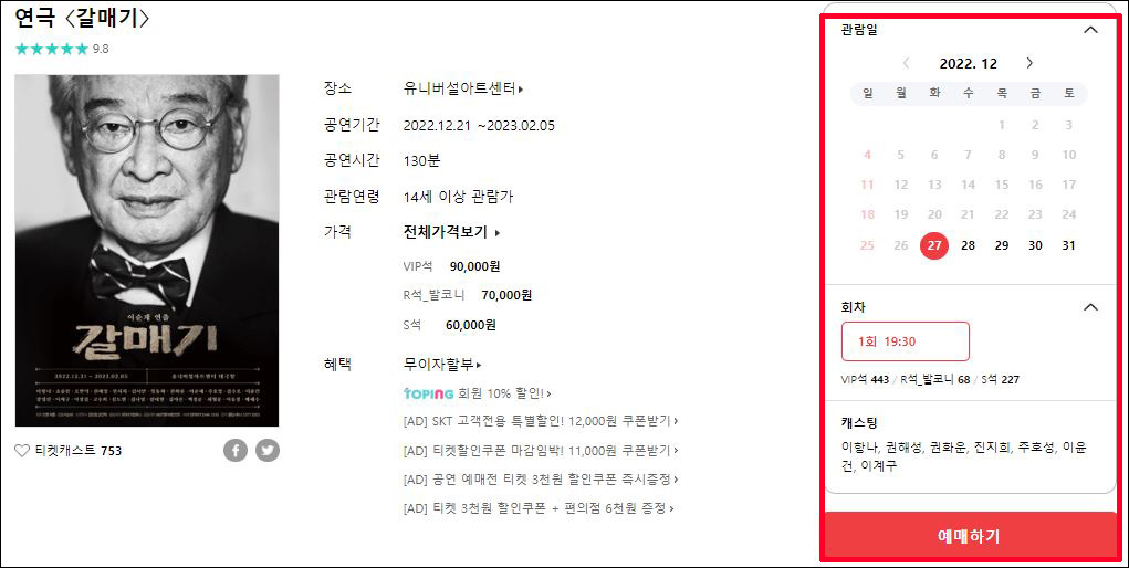 연극 갈매기는 인터파크티켓 홈페이지에서 예매가 가능하다. 아래의 통해 예매가 바로 가능하니 참고하시길 바란다.