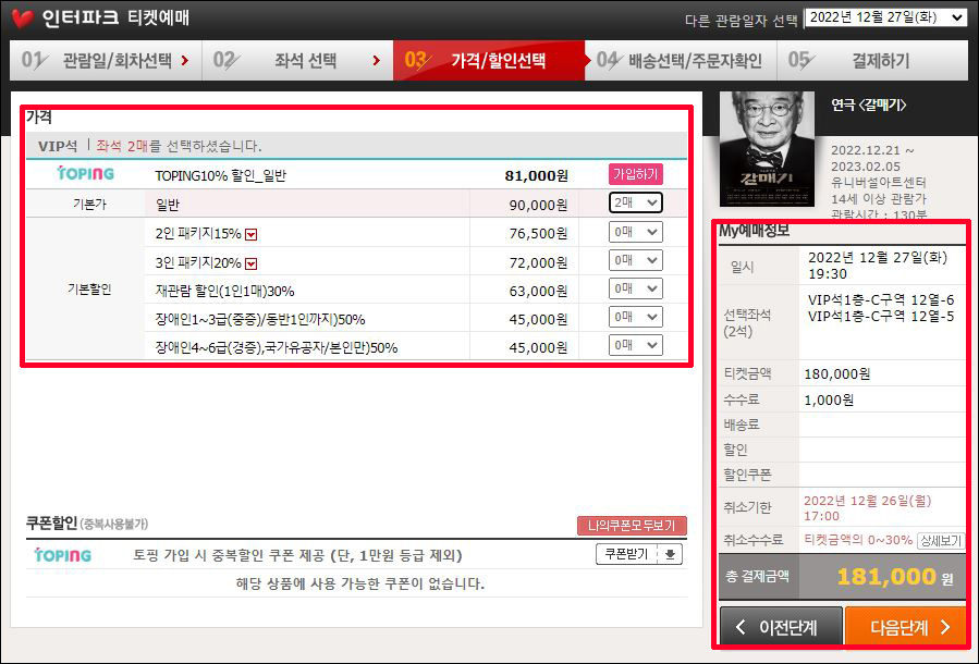 ④ 가격 및 할인선택 > 매수 선택 > 총 결제금액 확인 > 다음단계