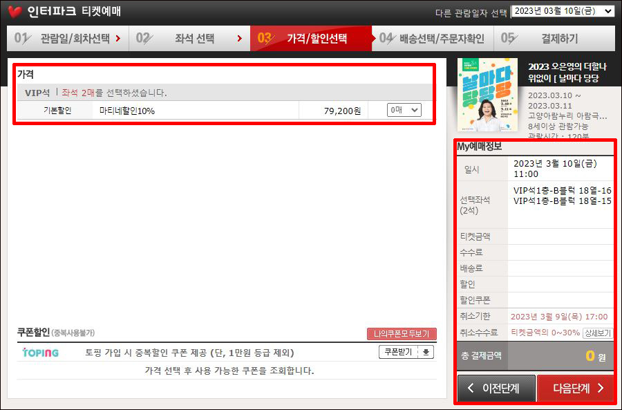 ④ 가격과 할인정보 확인 → MY 예매정보확인 → 총 결제금액 확인 → 다음단계 클릭합니다.