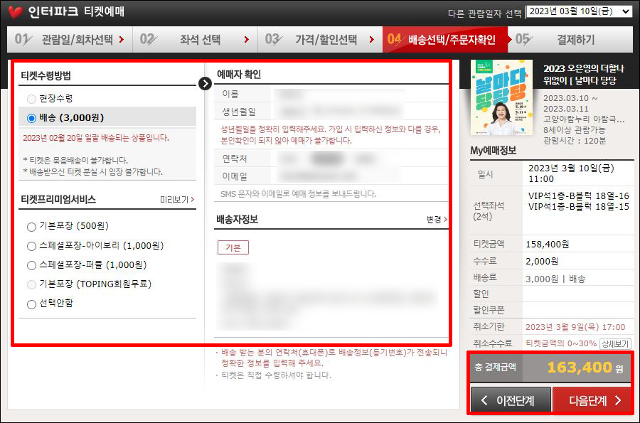 ⑤ 티켓 수령방법 선택 → 예매자 정보 확인 및 수정 → 배송자 정보 확인 및 변경 → 총 결제금액 확인 → 다음단계를 눌러줍니다.