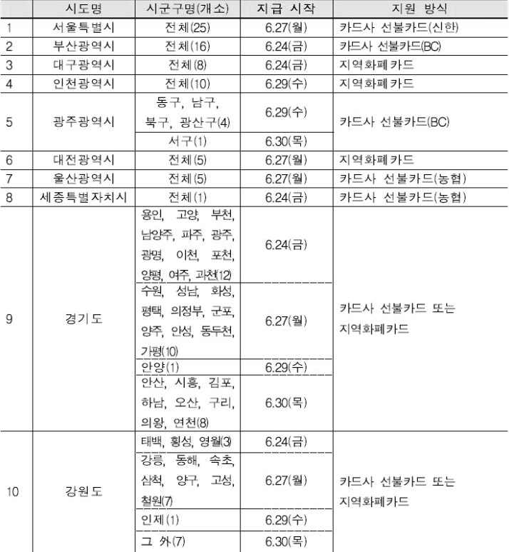 지급일자는 각 지차제 마다 상이하나 6월 중 지급 예정으로 부산, 대구, 세종시는 24일 지급될 예정이고 서울, 대전, 울산, 제주는 27일 지급합니다. 기타 지역은 아래를 참고하시길 바랍니다.