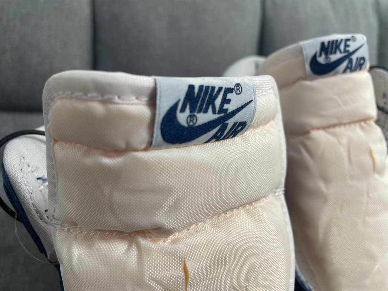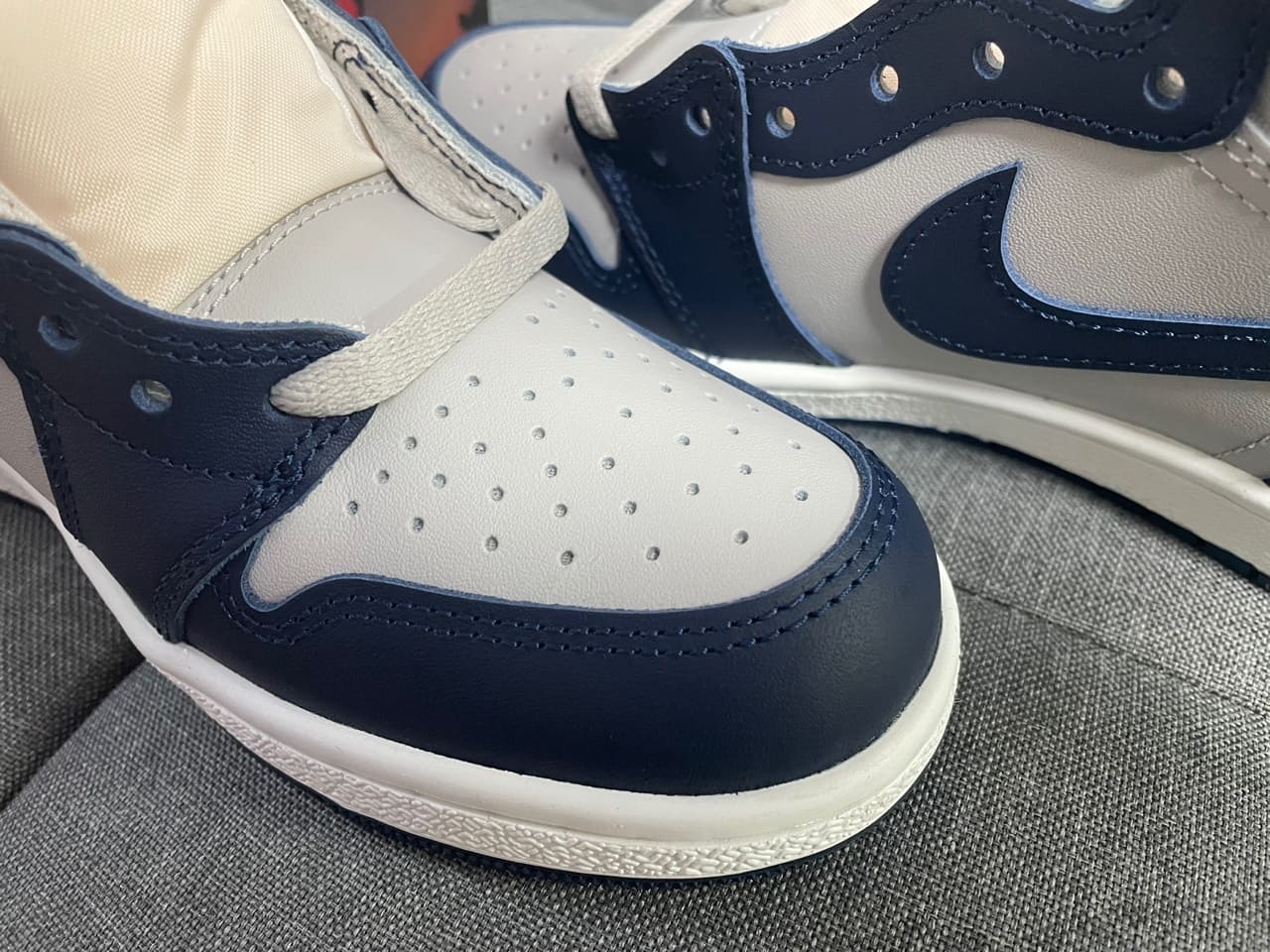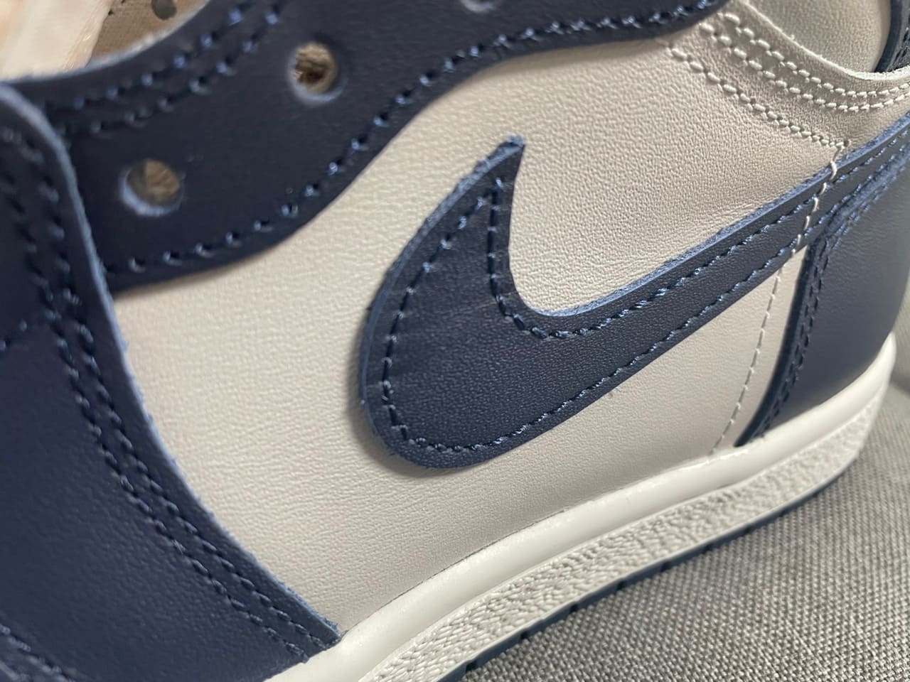 차이점이 느껴지시나요? 바로 조던 1의 윙 로고는 보통 음각으로 되어 있지만, 85 모델의 경우는 위 사진과 같이 양각으로 표현되어 있습니다.