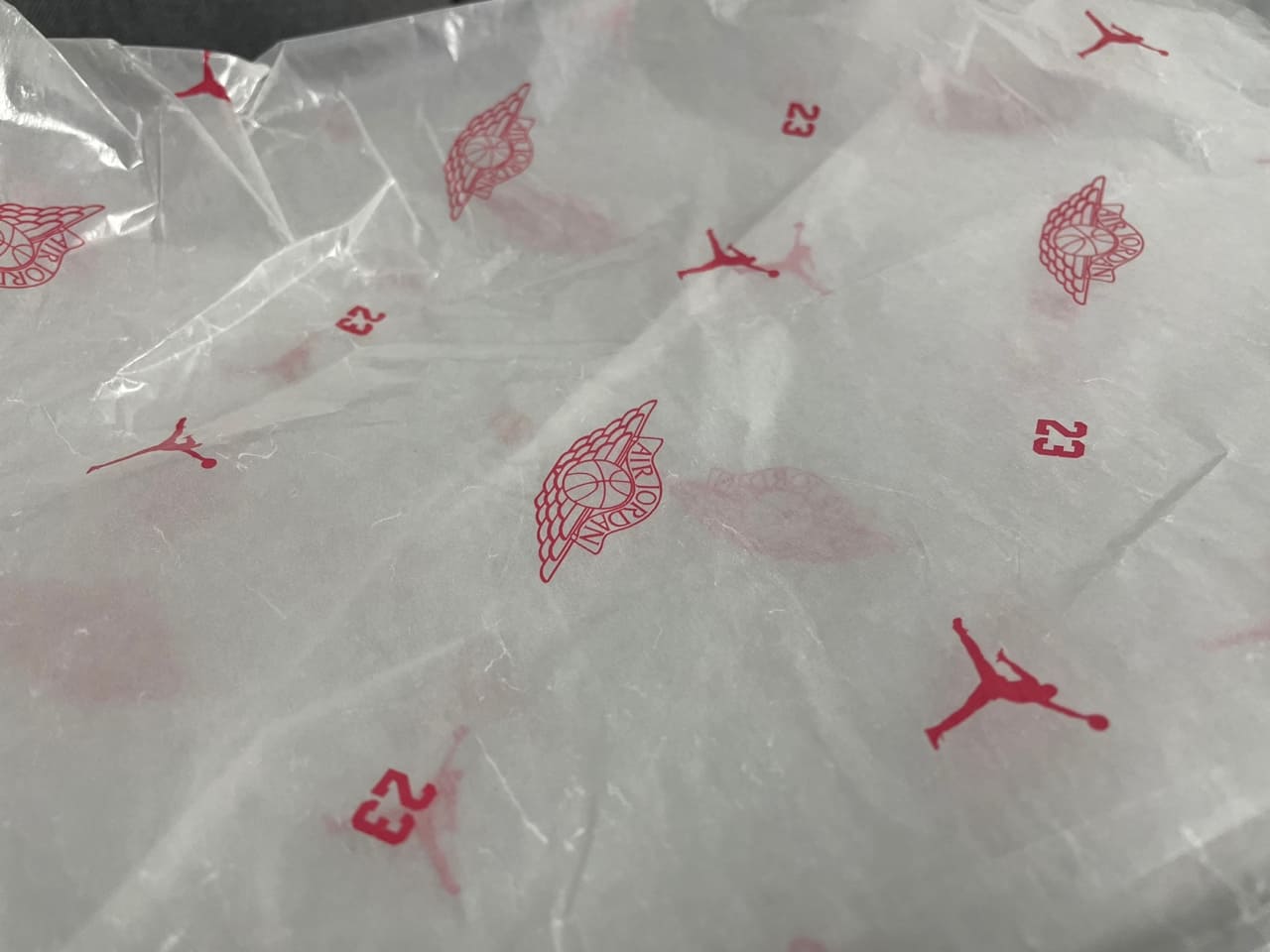 조던 1 85 조지타운의 박스탭과 포함된 속지입니다. 박스탭은 기존의 탭과 차이는 없으며, 속지는 레드컬러의 박스와 같이 레드 컬러의 조던 넘버 로고, 점프 로고, 윙로고 패턴이 적용되었습니다.