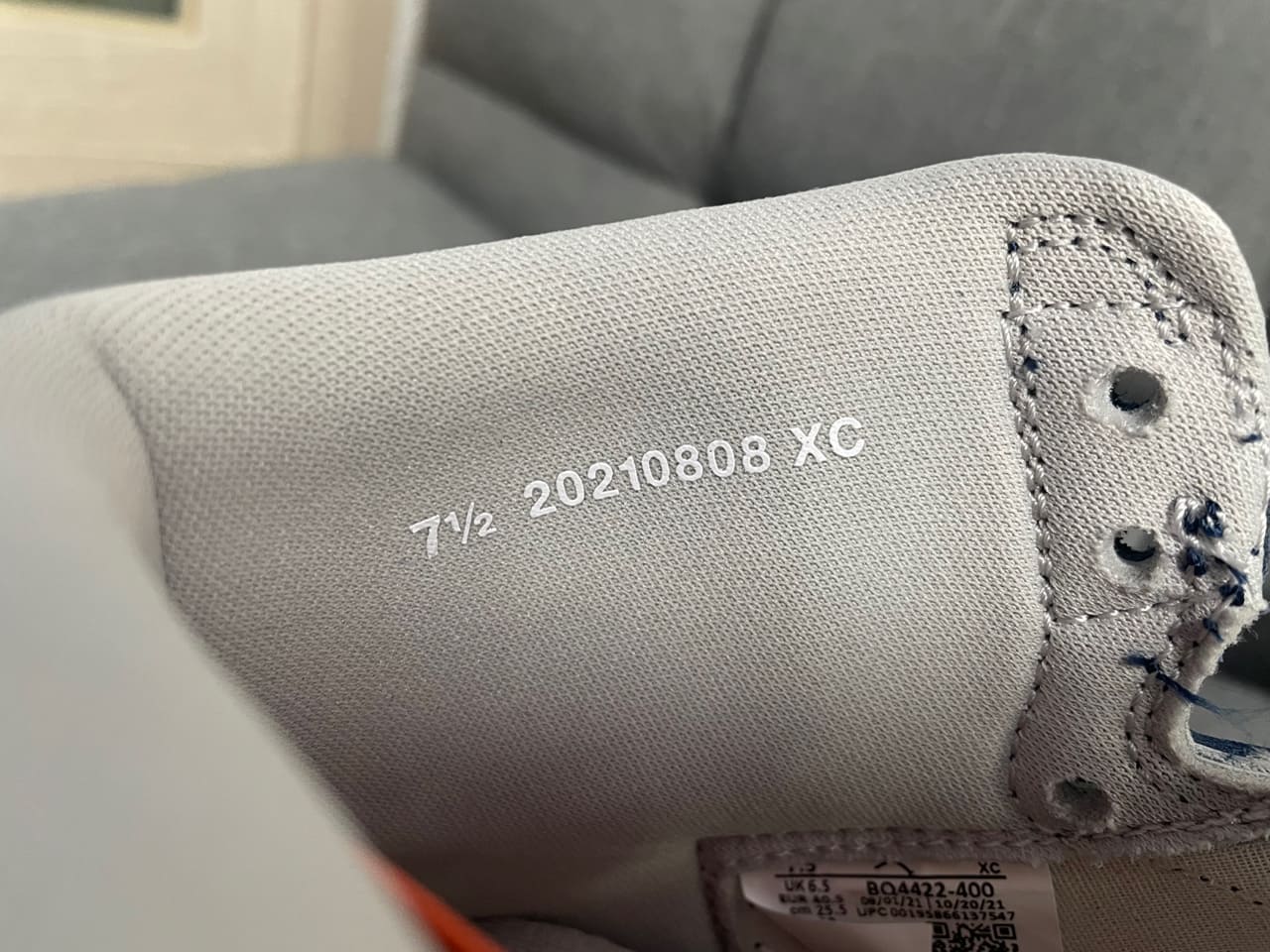 또 안쪽에는 7 1/2 20210808 XC란 넘버링이 라미테이팅 되어 있어, 조던 85 모델의 특별함을 더합니다.
