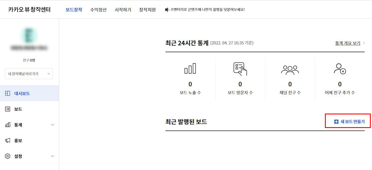 5. 위의 방식으로 채널을 만들었습니다. 이제 크레이터가 되어 큐레이션을 해보실 수 있습니다. 우측의 새 보드 만들기를 클릭해주세요