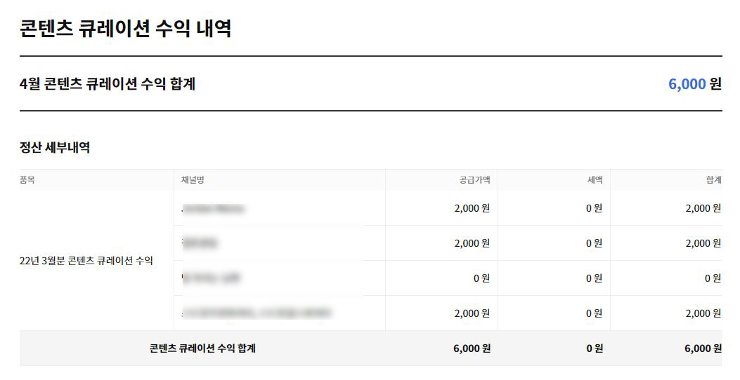 4월 콘텐츠 수익은 6,000원을 받았습니다. 작은 돈이지만 하루 5분 가끔 생각날 때마다 해보았기에 수익이 작습니다. 많은 수익을 얻는 분들도 계시니 꼭 도전해보세요