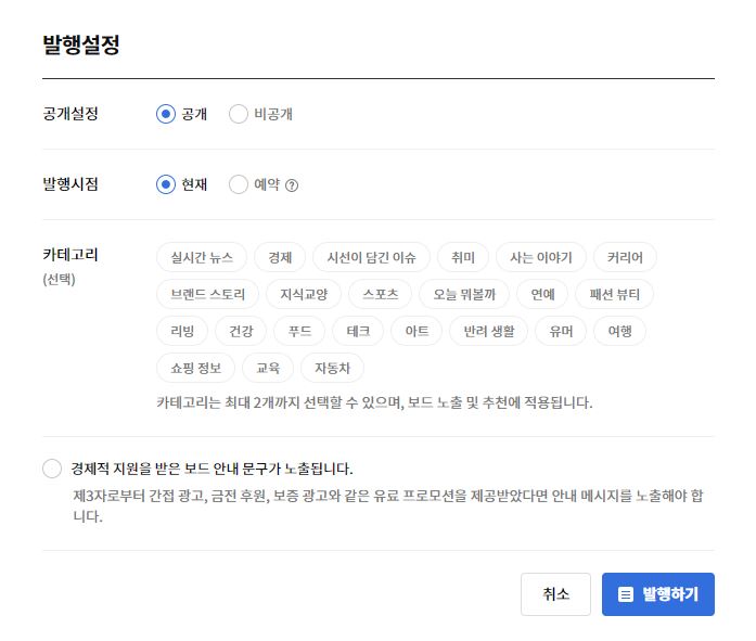 7. 보드 발행 후, 공개 설정 및 발행 시점을 지정해주고 카테고리를 설정해주세요 경제적인 지원을 받은 제품 리뷰 등의 글들을 발행 시 경제적 지원을 받은 보드 안내 문구를 설정해주세요. 보드 발행이 완료되었습니다.