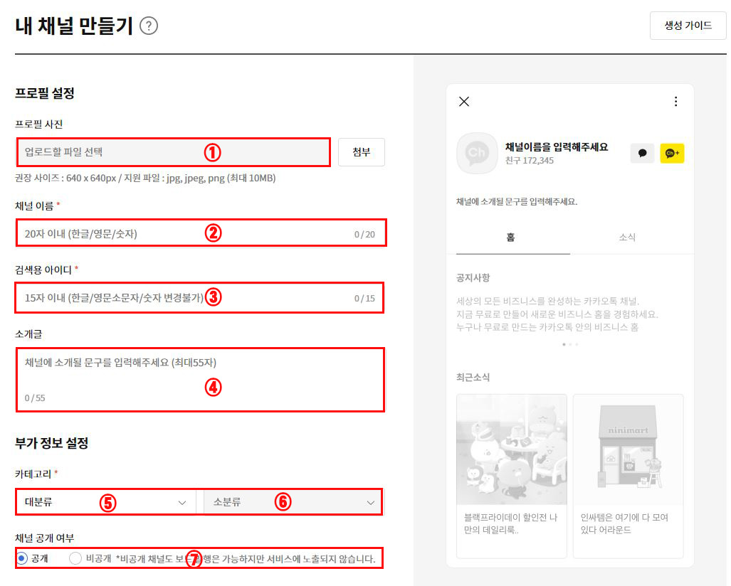 ⑦ 채널 공개 여부 - 공개로 해야지만 노출이 되니 꼭 공개로 설정합니다.