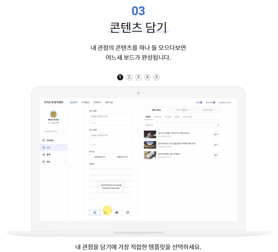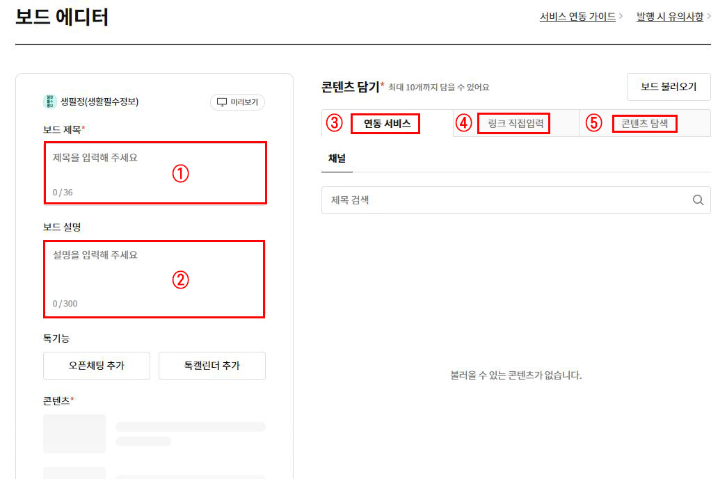 6. 보드 에디터 페이지에서 각 항목을 입력 후 콘텐츠를 담을 수 있습니다.