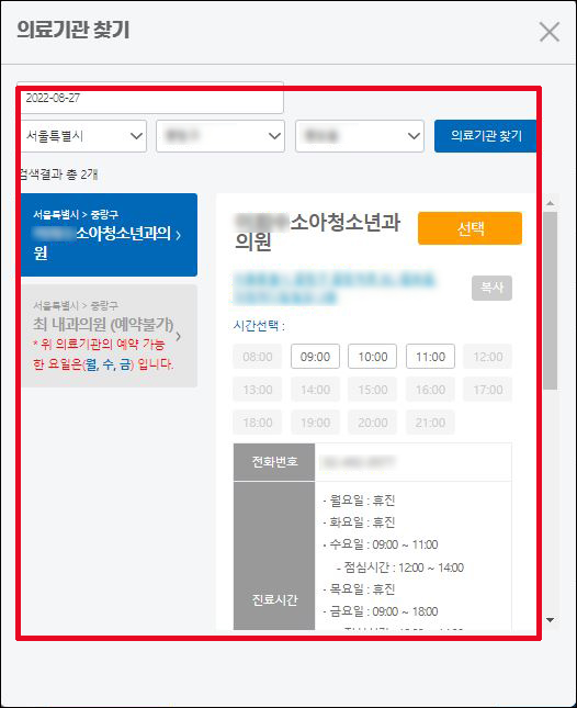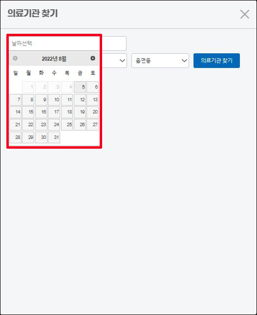 ⑦ 거주지 근처의 동네 정보와 <의료기관 찾기>를 통해 의료기관 선택 후 시간을 예약하시면 예약이 완료됩니다.