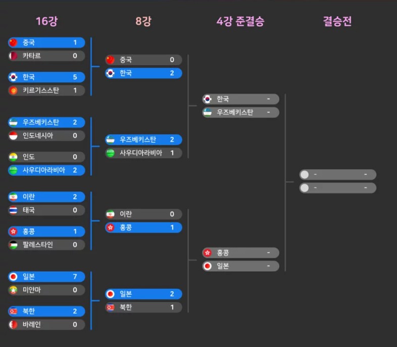 한국이 우즈벡을 꺽는다면 일본이나 홍콩을 상대로 결승을 치르게 된다.