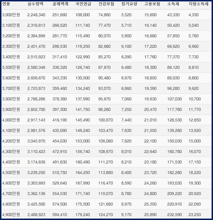 실수령 금액이 300만 원을 넘기려면 최소 연봉 4200만 원을 받아야 합니다. 연봉이 올라갈수록 4대 보험 및 소득세와 지방세의 금액도 소폭 상승합니다.