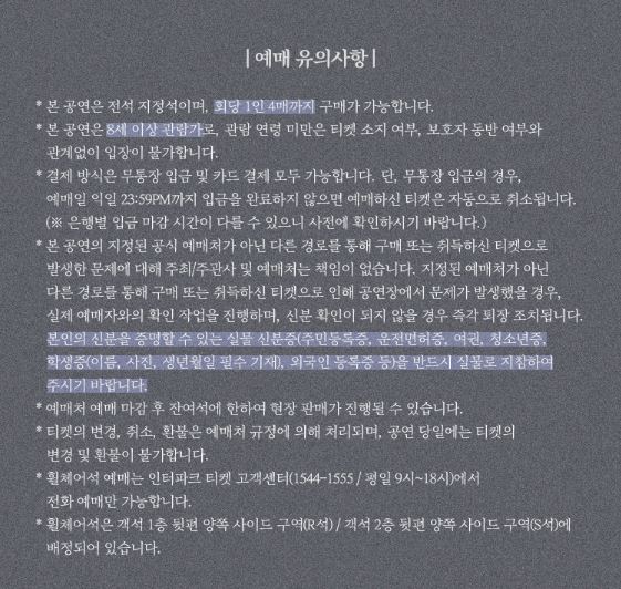 - 본 공연 티켓을 공식 경로가 아닌 다른 경로를 통해 구매한 티켓에 대한 문제는 주최/주관사에서 책임지지 않습니다.